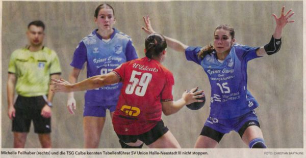 Aber zurück zum Spiel. Zu Beginn hielten die Gastgeberinnen noch gut mit. Zwar legten die Gäste von Beginn an vor, aber Calbe schaffte stets den Ausgleich und bis zum 7:7 (14.) blieb die Partie ausgeglichen. Dann häuften sich auf TSG-Seite die Fehler und Union konnte auf 10:7 erhöhen. Nach einer Auszeit erkämpfte sich Calbe den 9:10-Anschluss, musste die Gäste aber bis zur Pause auf 12:16 ziehen lassen. Den Start in die zweite Halbzeit verschlief Calbe total und Union baute die Führung auf 20:13 aus. Ab der 35. Minute musste dann Feldspielerin Lisa Heinrich ins Tor. Calbe verkürzte den Rückstand zwar noch einmal auf 19:24 (50.), eine Wende sollte aber nicht mehr gelingen. Der Tabellenführer erhöhte in den Schlussminuten und gewann am Ende verdient. TSG-Trainer Frank Falke fasste das Spiel so zusammen: „Wir konnten heute leider keine Top-Leistung abrufen, aber die hätte es gebraucht, um den Favoriten zu überraschen. Unsere Fehlerquote war insgesamt zu hoch, die Abwehrarbeit phasenweise zu passiv und im Angriff verlieren wir etliche Bälle, kassieren so einfache Gegentore und gehen nicht in die Tiefe. Daraus müssen wir lernen und solche Negativerlebnisse gehören zum Entwicklungsprozess der Mannschaft einfach dazu. Zunächst aber wünschen wir als gesamtes Team unseren beiden Torfrauen Josephin und Pia gute Besserung“.