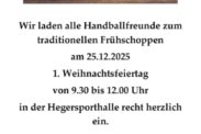 14.Dezember 2025 | AktuellAm 11. Dezember veranstaltete die TSG-Handballabteilung ihre traditionelle Rentner-Weihnachtsfeier für die älteren Mitglieder. Insgesamt 39 Mitglieder der Abteilung und des Fördervereins waren der Einladung in die Heger-Sporthalle gefolgt und erlebten dort besinnliche und stimmungsvolle Stunden. In gemütlicher Runde wurde gemeinsam in alten Erinnerungen geschwelgt. Höhepunkt war wieder einmal der Auftritt der Handball-Minis, die unter der […]